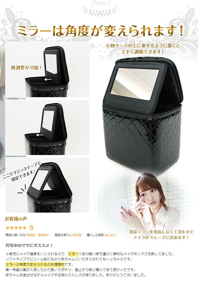 ソフト メイクボックス 【キルティング】 ◆ バニティ 鏡付き 人気 プロ用 可愛い かわいい コスメボックス 軽量 女性 彼女 ギフト プレゼント ◆ 商品スペック 楽天市場ランキング1位常連のソフトメイクボックスから、 オシャレで可愛いキルティング加工Ver.が登場!! エナメル生地をベースにキルティング加工され、 ソフトタイプながら、大変丈夫に作られております♪