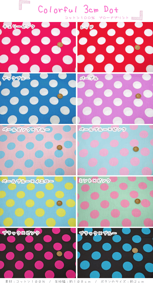 『Colorful 3cm Dot≪カラフル約3cmドット≫』コットン100%ブロードプリント●生地幅:約108cm ●素材:コットン100%【定番】