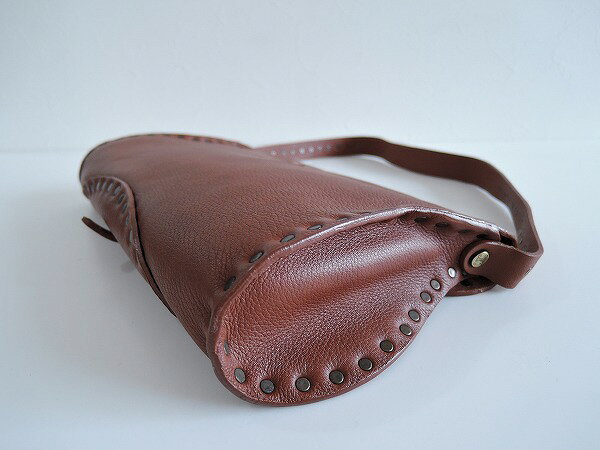 カラーはブラウンで、シボのあるレザー素材にアンティークゴールドのスタッズが施されております。