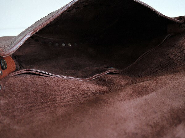 開口部はマグホック留めのフラップ仕様で、内側の背面にオープンポケット&スナップボタンポケットが1つずつございます。